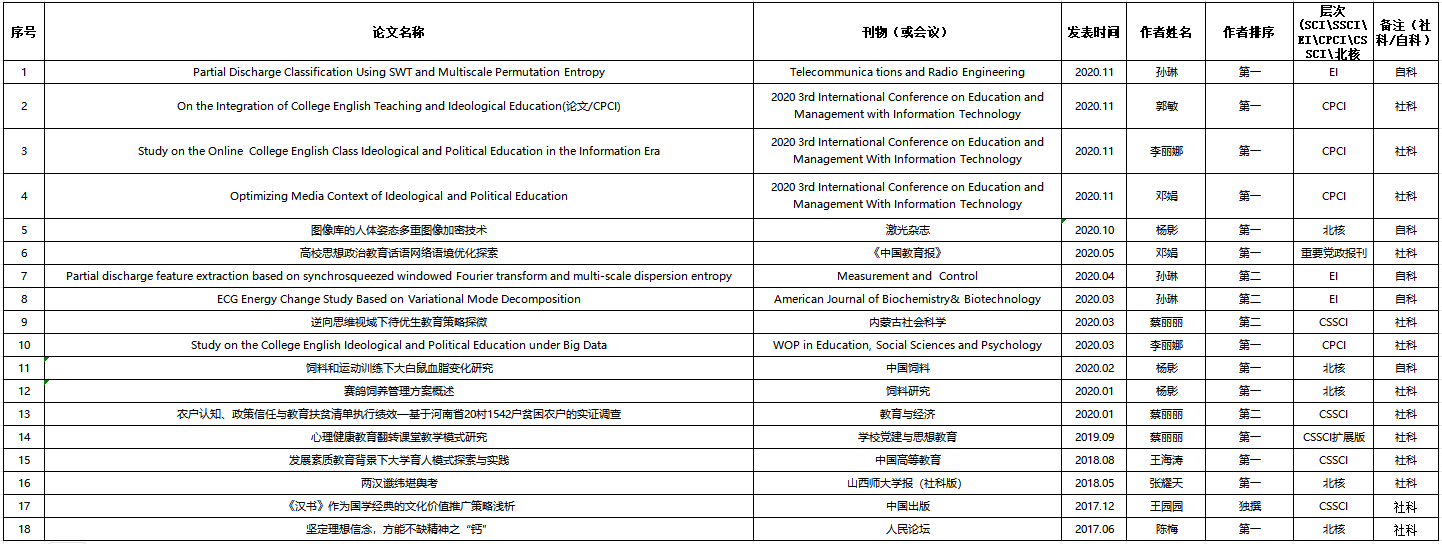 近年来,学院教师在《中国高等教育》《青年研究》《中国教育报》《中国社会科学》等学术期刊、重要党政报刊公开发表论文60余篇,其中SCI/SSCI/CSSCI/EI/CPCI检索论文40余篇,出版著作30余部、教材14部。