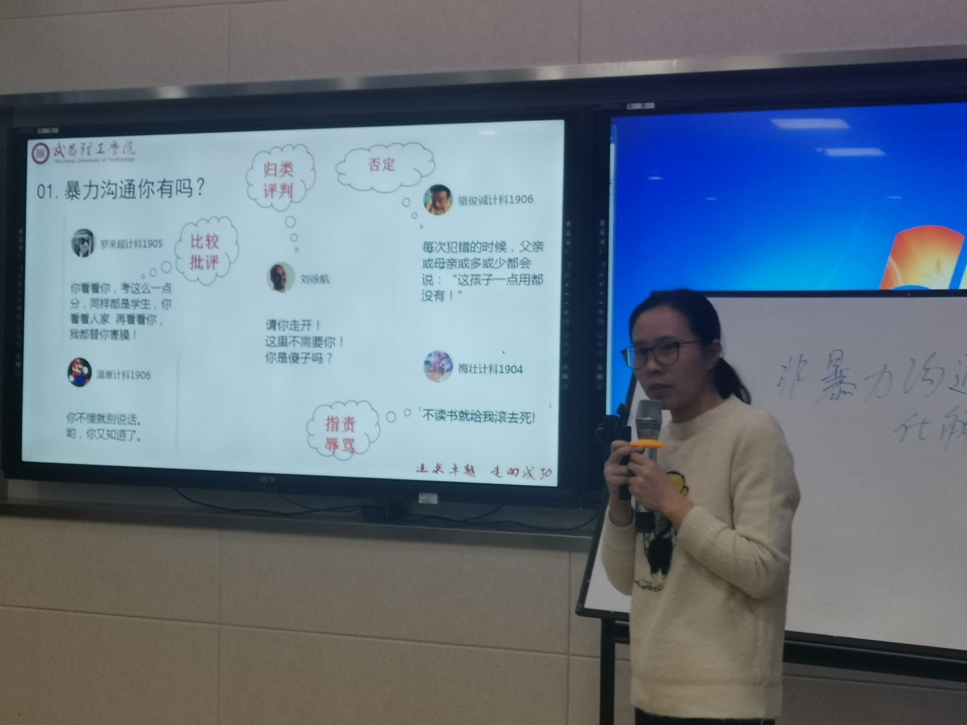 参赛教师按抽签顺序进行授课展示,并现场回答评委提问,评委分别对授 课教师授课展示和现场答辩进行评分。1号选手李芳老师以“如何突破思维定势”为主题,结合习近平总书记重要讲话精神,主要讲授了从解放思想、敢于质疑、转换视角和积累知识四个方面来突破思维定势,并引用习近平总书记对青年的寄语,勉励青年大学生要不为思维定势所固化、不为安逸现状所钝化,积极进行创新活动,为实现中华民族伟大复兴的中国梦贡献青春力量。2号选手陈梅老师针对学生人际关系冲突中的沟通困惑问题,利用云班课中收集的学生经历的暴力沟通案例进行分析,提出解决非暴力沟通的四个要素来化解人际冲突。3号选手邬正阳老师以“创业资源”为主题,主要讲授了创业资源的定义和类别,运用相关案例对人力资源,财务资源,物质资源,技术资源和组织资源四个知识点进行讲述,并根据教学内容的实际情况布置了相关的课后作业和延伸学习资料。4号选手徐蓓老师利用习近平总书记新年贺词引出大学生“追梦”要从学业开始,通过案例引入和分析,指出学业成功包括取得相应的专业学位、具备不断开拓生存领域和发展空间的成功素质,并应将个人理想融入国家发展之中,将个人前途和国家民族命运相结合。