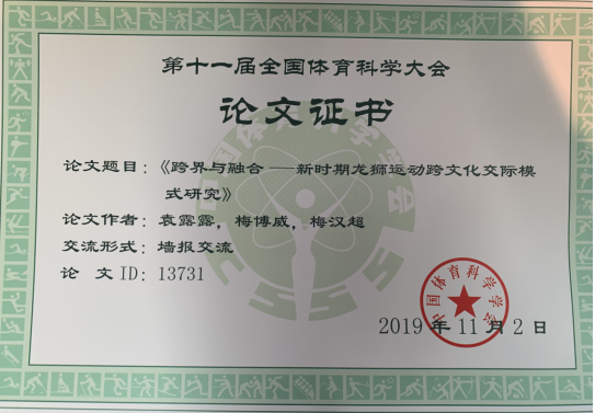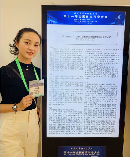 11月1日由中国体育科学学会主办、南京体育学院和南京大学承办的第十一届全国体育科学大会在南京开幕。来自国家体育总局各有关单位、全国体育科研院所、高等院校、日本、德国、法国、芬兰、欧科会4000多名中外专家学者和体育企业代表参加了大会。此次专题报告2000余篇,墙报交流2000余篇;以大会报告、专题报告、国际学术论坛、墙报交流、热点沙龙等多种形式进行学术交流。我校体育课部教师袁露露因论文《跨界与融合——新时期龙狮运动文化交际模式研究》被组委会录用,受邀参加大会论文墙报交流。