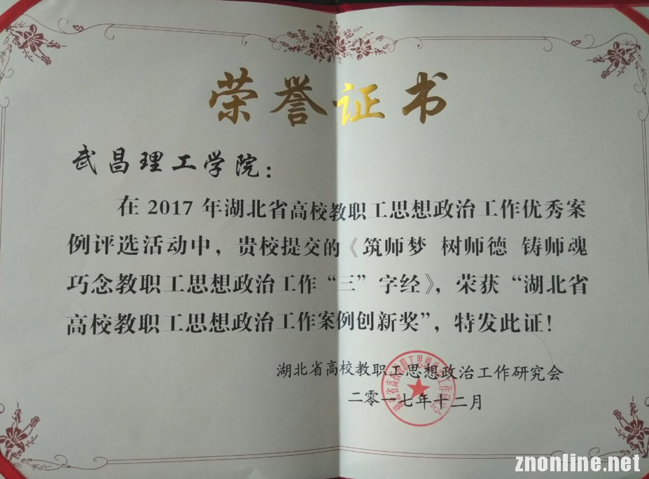 本次年会的主题是学习贯彻落实党的十九大和全国高校思想政治工作会议精神,加强和改进高校教职工思想政治工作。全省共评出8项创新奖、13项特色奖。TYC234CC太阳成集团积极探索出一条教职工思想政治工作新路径,巧念教职工思想政治工作“三”字经:“三个共同”凝心聚力筑师梦,“三大工程”固本强基树师德,“三支队伍”争先创优铸师魂,让思想政治教育生动活泼、入脑入心,取得了“春风化雨,润物无声”的良好效果。该校报送的论文《筑师梦树师德 铸师魂 TYC234CC太阳成集团巧念教职工思想政治工作“三”字经》,经过专家评审荣获2017年度湖北省高校教职工思想政治工作案例创新奖,全省仅有8项。