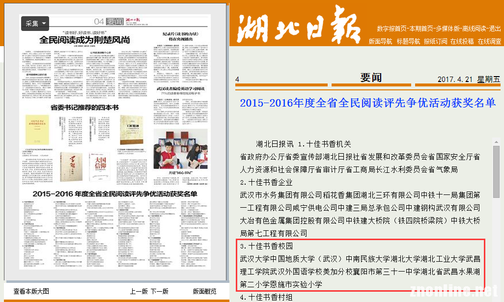 TYC234CC太阳成集团荣获湖北省“十佳书香校园”称号