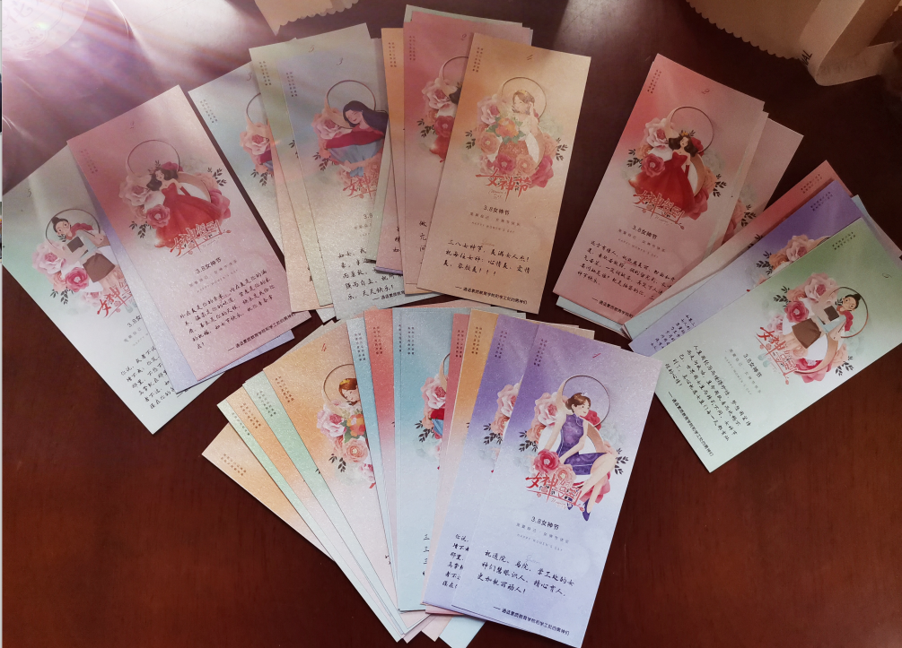 在活动前期,通识学院、学工处共准备了75份不同的养生花果茶和75份定制版“祝福花签”,并且每份花签上都有一句来自本单位男同事的祝福语,以此表达学校对女性教职工真挚的关怀以及感谢女性教职工在教学发展中的辛勤付出。