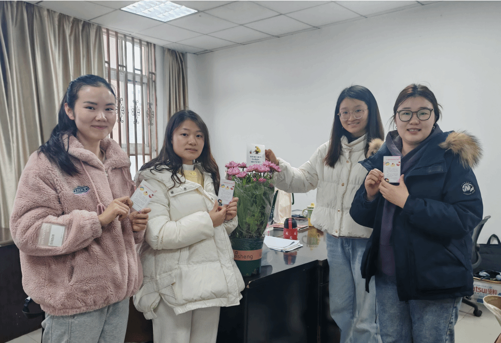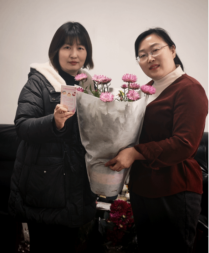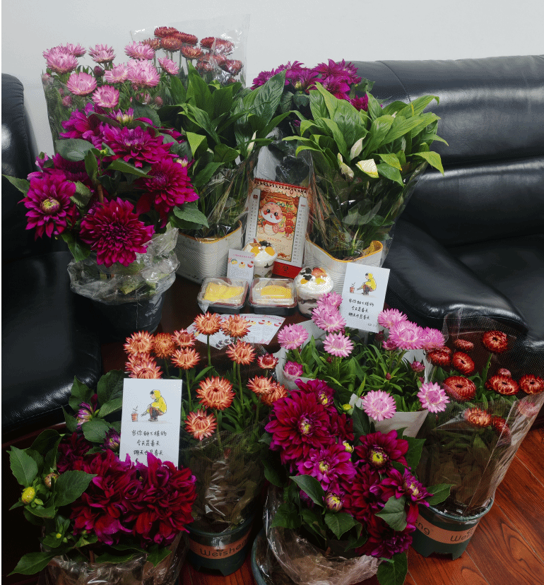活动现场,工会精心准备了定制糕点券与春季开花绿植礼包。每位女教师都收到了一张印有节日祝福语的糕点券,券面设计融入多巴胺色彩和学院特色元素,让这份祝福既实用又充满仪式感。走进各办公室,一盆盆精心挑选的大丽菊、麦秆菊与白掌整齐摆放,翠绿的叶片间点缀着娇艳花朵,令人眼前一亮。每盆绿植旁还贴心放置了养护手册,扉页上写着:"当你种下植物,今天是春天,明天也是春天",既传递了生态理念,也寄托了对美好生活的祝愿。