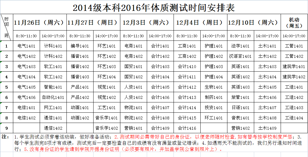 - 测试时间:11月26日-12月11日非工作日的8:00-11:30,14:00-17:30测试。每个班级时间安排见附表。
