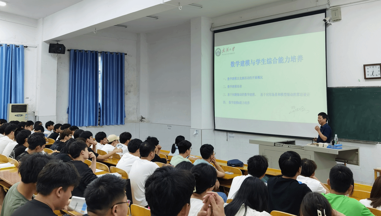 讲座中,羿旭明教授介绍了全国大学生数学建模竞赛活动的开展情况,并分享了武汉大学多年来参赛的成功经验,阐述了数学建模在锻炼学生、培养学生综合能力中所起到的重要作用。羿教授从基本建模方法、计算机语言及算法、数模论文写作以及模拟训练四个方面详细的给大家讲述了如何做好数学建模赛前准备,并强调了竞赛中团队合作要胜于分工。接着羿教授通过“小行星运动轨道的确定问题”“谐波信号参数的盲反演问题”“波浪能最大输出的功率设计”三个典型案例,详细讲述了基于问题驱动的数学建模以及基于模型和应用场景(问题)驱动的算法设计,并向大家展示了数学建模中常用的一些方法与技巧。他指出,较为精确的模型往往需要考虑多方面的因素,基于模型驱动的算法往往需要具备较为全面的数学知识,也需要掌握一定的数学软件和编程技巧。通过建模学习和培训,能极大地扩展大家的知识面,提升学习能力、实践能力、创新能力、协作能力,正因为如此,数学建模竞赛才得到了社会、高校以及大学生的广泛认可。