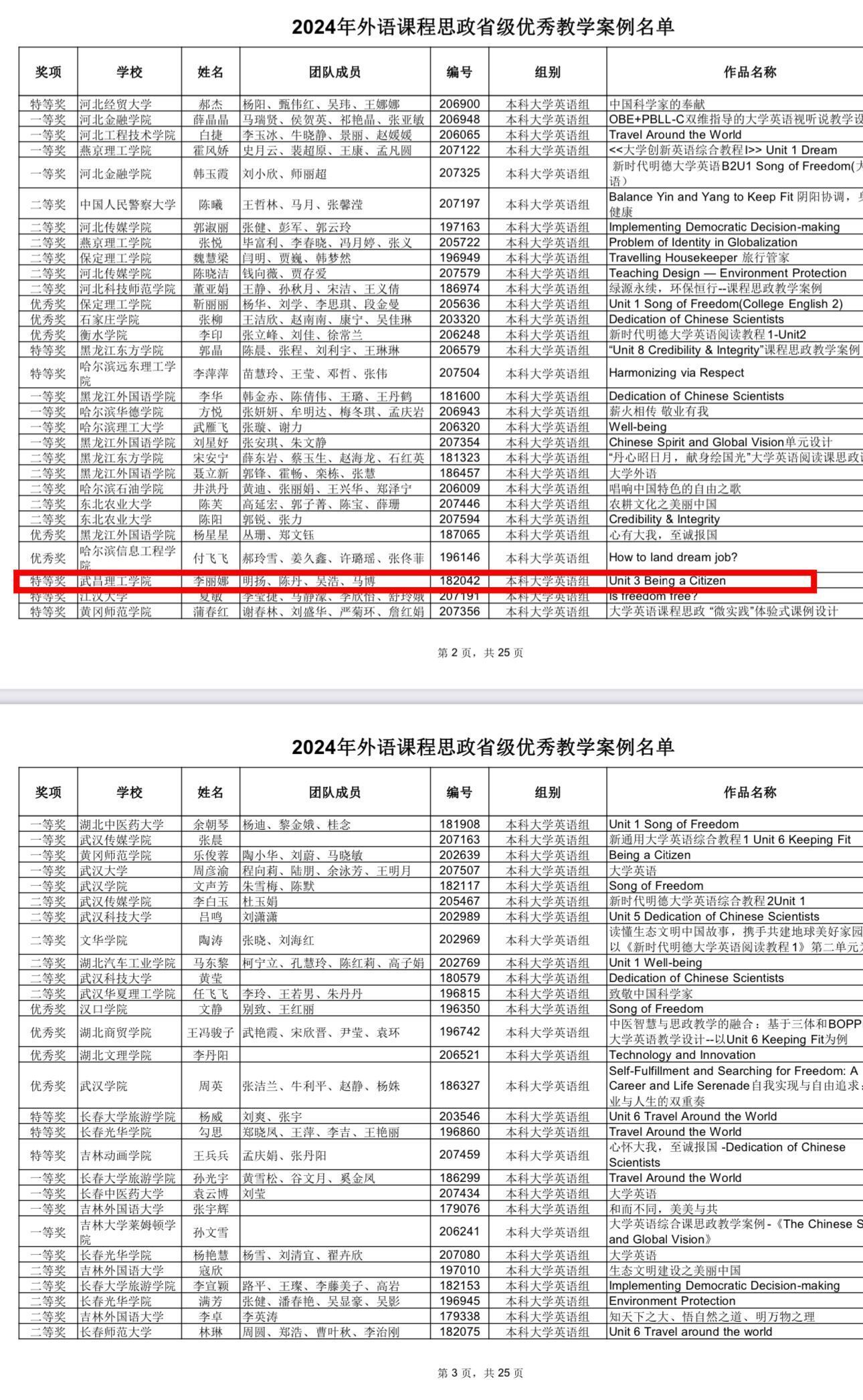 为深入学习贯彻习近平新时代中国特色社会主义思想及2024年全国教育工作会议精神,落实立德树人根本任务,持续推动全国高校外语课程思政高质量建设,全面提升外语教师课程思政教学能力,高质量推进课堂教学改革,强化高素质教师队伍建设,高等教育出版社、全国高校教师网络培训中心与中国外语编辑部共同开展了2024年外语课程思政优秀教学案例征集与交流活动,2024年7月30日公布了晋级省级交流活动名单,2024年10月14日公布了省级优秀教学案例名单。我校大学英语课部的李丽娜教师团队荣获湖北省特等奖(全省同类高校唯一),并成功晋级国赛环节。