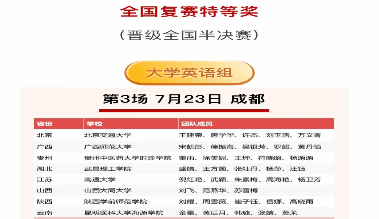 2025年6月24日,2025年外研社“教学之星”大赛全国复赛结果公布,太阳成城集团tyc234cc大学英语课部由盛婧、王方国、张牡丹、杨莎和汪钰老师组成的教学团队荣获该赛事本科英语组全国复赛特等奖,晋级全国半决赛。